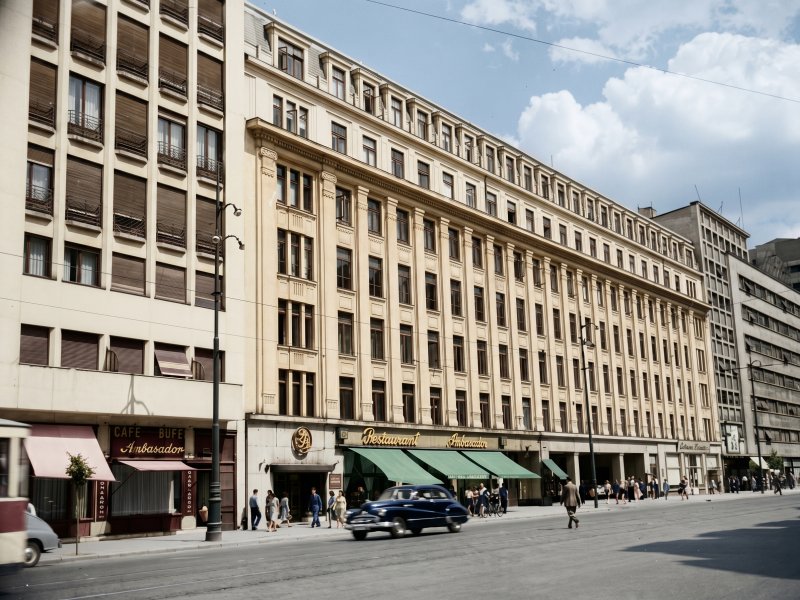 Hotelul Ambasador are o eleganță ușor teatrală, aparținând lumii interbelice care comanda șampanie, dansa până târziu și își făcea intrarea pe Magheru ca pe scenă. El este printre hotelurile reprezentative ale valului Art Deco bucureștean, imobilul fiind proiectat de Arghir Culina și inaugurat la 4 mai 1939. Amplasarea lui, între Garajul Ciclop și zona ARO, îl transformă într-o piesă centrală dintr-un ansamblu urban care a schimbat definitiv fața bulevardului. Cu alte cuvinte, aici, Bucureștiul și-a pus costumul bun și a ieșit în lume.