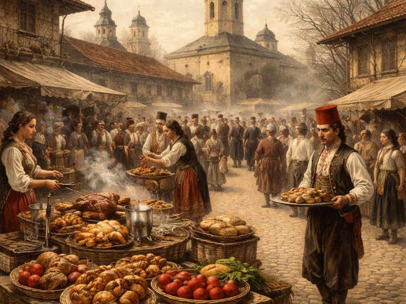 Bucureștiul acelei vremi era un oraș cu două fețe gastronomice distincte. Boierii și negustorii înstăriți trăiau deja sub influența bucătăriei fanariote, îmbogățite cu ingrediente grecești, turcești și, tot mai mult spre mijlocul secolului, cu rafinamentele franceze. Mahalalele și oamenii de rând aveau propria lor masă — mai simplă, dar nu mai puțin ritualizată.