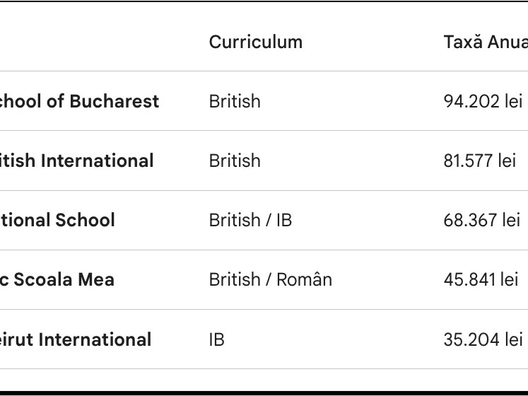 Iată o listă rapidă a școlilor care oferă predare exclusivă în limba engleză și taxele lor publice pentru 2025/2026: