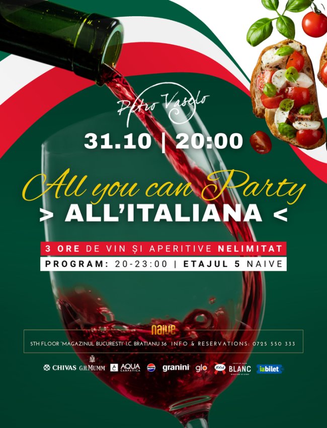 Atmosfera va fi completată de un DJ Set cu hituri italiene, de la San Remo până astăzi – pentru o seară vibrantă, relaxată și plină de savoare.