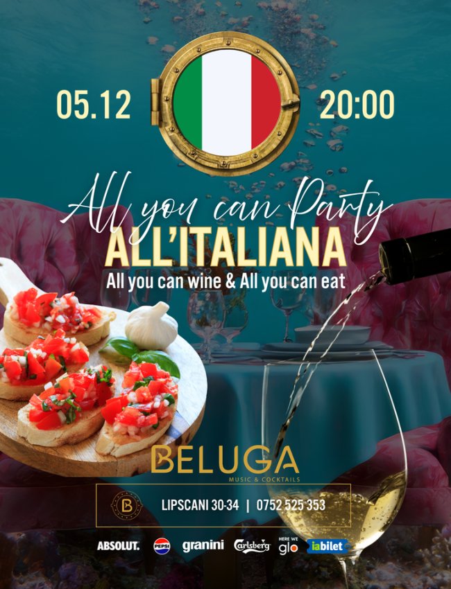 Plătești o taxă unică și, timp de 3 ore, te bucuri de aperitive italiene nelimitate și vinuri la discreție, oferite de Caii de la Letea, pentru o seară de neuitat la Beluga.