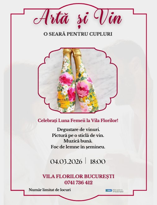 Programul include degustare de vinuri și un atelier ghidat de pictură pe sticlă de vin. Veți crea împreună o sticlă personalizată, pe care o veți lua acasă. Nu este doar o ieșire în oraș, ci un obiect care rămâne.