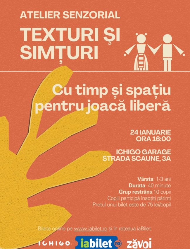 Atelierul propune o serie de instalații senzoriale și materiale tactile — cutii de explorare, texturi naturale și suprafețe variate — care îi invită pe copii să exploreze în ritmul propriu, fără un parcurs prestabilit. Activitatea se desfășoară în grup restrâns, cu părinții prezenți, și pune accent pe experiență, curiozitate și timp petrecut împreună.