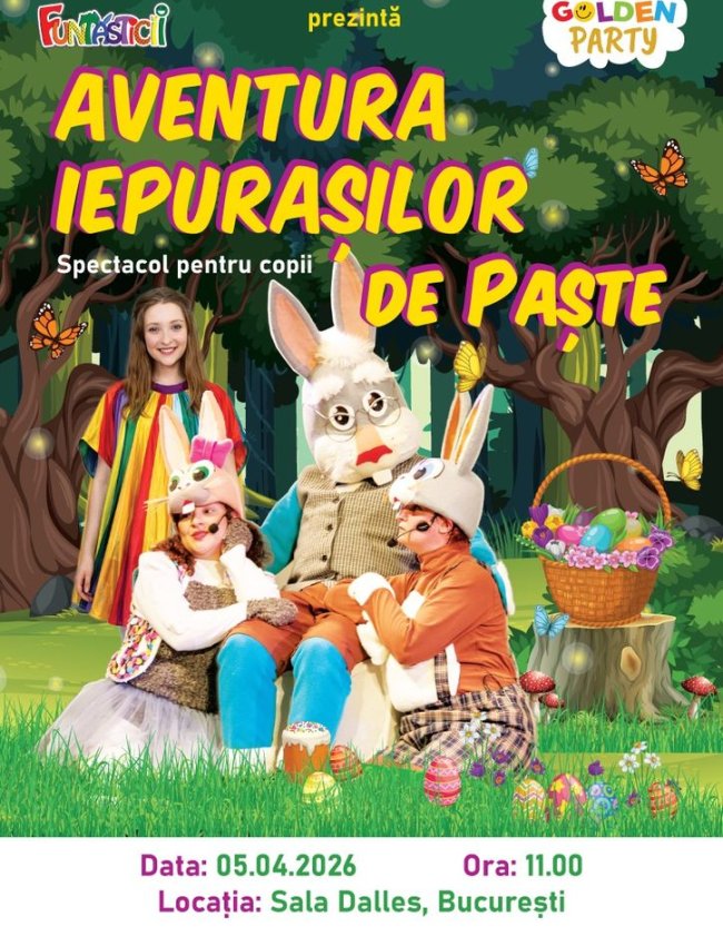 Spectacolul „Aventura Iepurașilor de Paște ” este o călătorie ce merită făcută cu toată familia — vom cânta, vom dansa, vom râde și ne vom bucura împreună de magia Paștelui într-un show plin de energie și surprize.