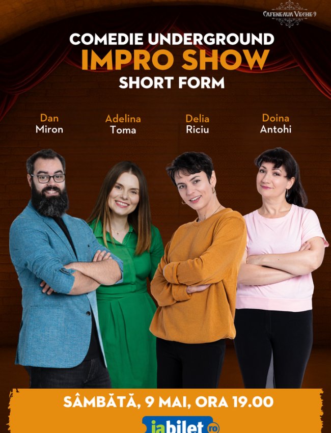 De ce impro show? Pentru că asta facem, un spectacol de comedie creat pe loc, deci cum am zis comedie underground. N-avem regie, scenariu sau replici învățate de acasă. Așa cum ne trezim (o să ne îmbrăcăm frumos, nu venim în pijamale), venim pe scenă și improvizăm, pornind de la sugestiile voastre de locuri, meserii, relații, titluri de povești și ce ne mai trăznește pe noi.