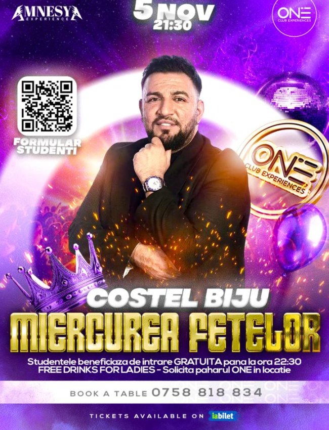 Pe 05 Noiembrie, de la ora 21:30, te așteptăm la One Club Experiences la o nouă ediție a conceptului „Miercurea Fetelor”, alături de Costel Biju.