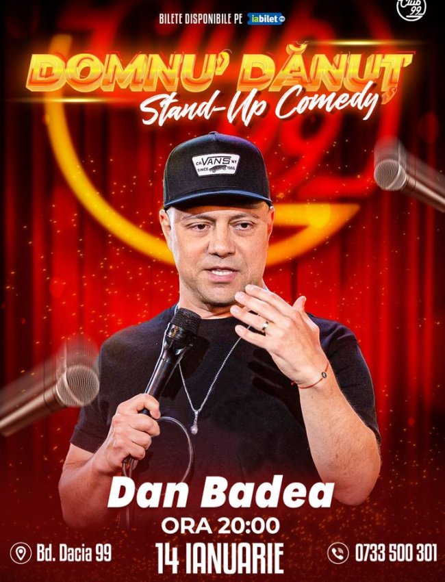 Miercuri de la 20:00 vă așteptăm la o seară de stand-up comedy alături de Dan Badea și cel mai nou material de comedie al său, „Domnu' Dănuț”.