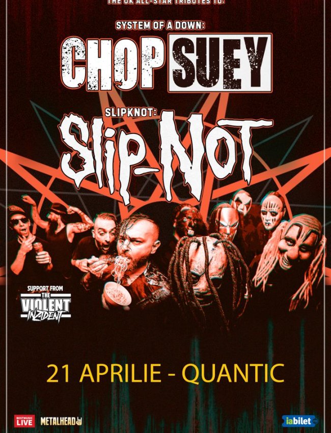 - CHOP SUEY este considerata ca fiind cea mai mare trupa tribut System of a Down din Europa. Bazele formatiei au fost puse in UK in 2015, Chop Suey avand in compenenta membrii din Dragonforce, Anti-Nowhere League, ex-Breed 77, TigerTailz si nu numai. Au o reptutie bine stabilita pe intregul continent pentru show-urile pline de energie in care interpreteaza piesele clasice ale celebrei formatii Armeno-Americana. Reusind sa aduca publicului prezenta scenica specifica SOAD de la inceputul anilor 2000, cu e executie muzicala impecabila, Chop Suey este o adevarata forta ce nu poate fi ratata.