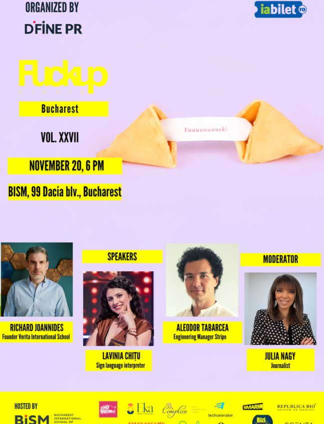 DiFine PR organizează pe 20 noiembrie ediția XXVII a Fuckup Nights Bucharest, în care invitați sunt Richard Joannides – fondatorul școlilor Verita International, Lavinia Chițu – expert interpret în limbajul semnelor și Aleodor Tabarcea – Engineering Manager Stripe și mentor pentru startups, studenți și ONG-uri.