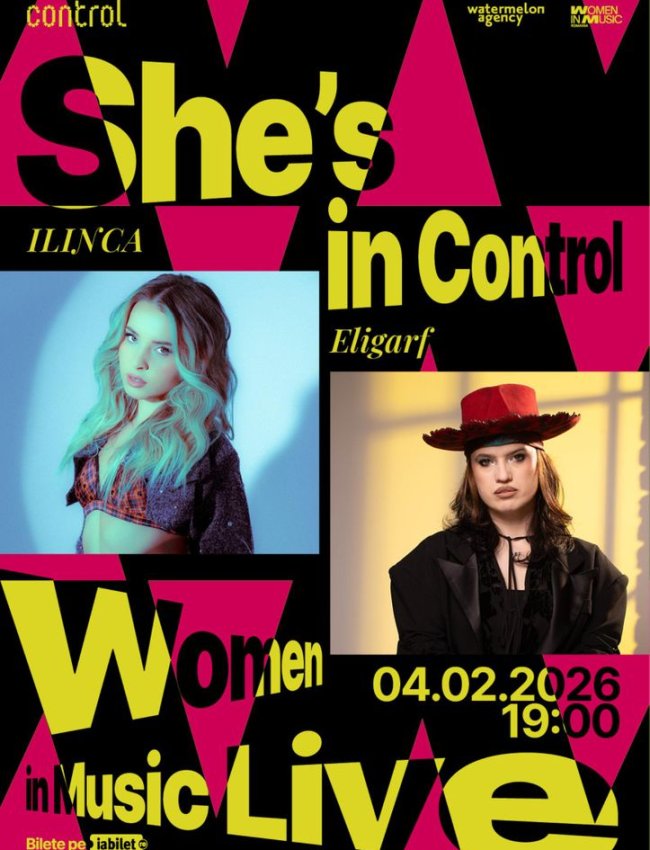 She’s in Control este o serie de 4 concerte duble care aduc pe aceeași scenă opt artiste din România, într-un spațiu în care muzica și poveștile lor se întâlnesc și își găsesc ecoul. Aici artistele se susțin și se ridică una pe alta, totul pornind de la motto-ul Women in Music: Strong women build each other up.