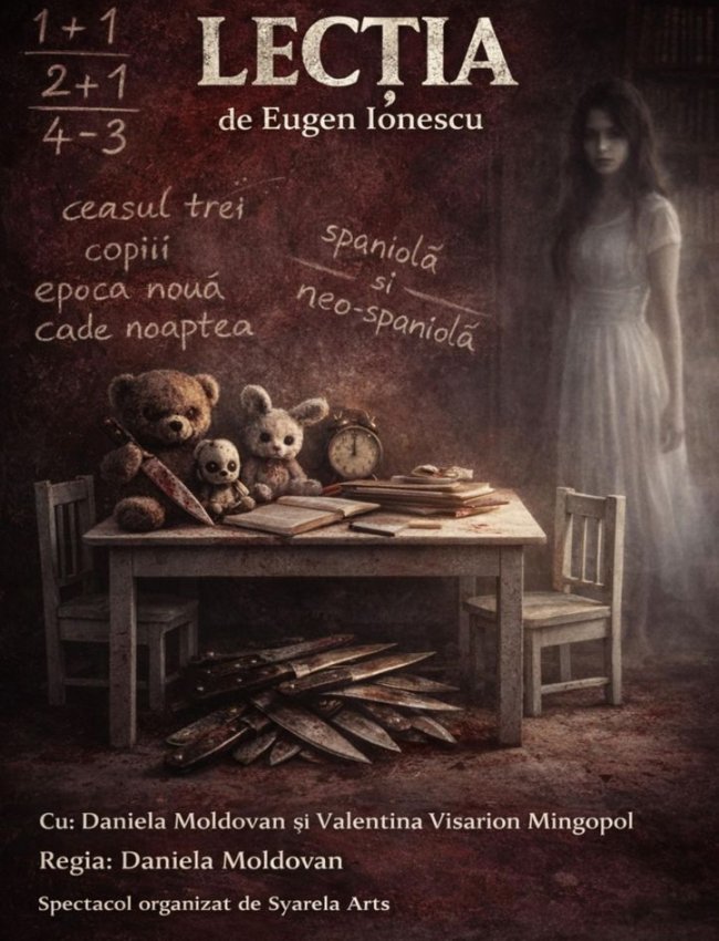 În spectacolul Lecția după Eugen Ionescu o profesoară și eleva sa pornesc într-o meditație inocentă care alunecă pas cu pas spre un teritoriu neliniștitor, unde cuvintele devin arme, iar logica se transformă în capcană.