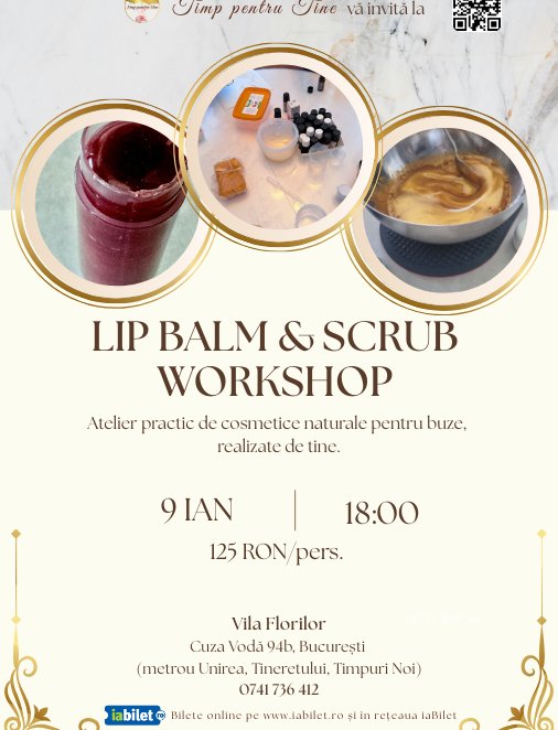 Pe parcursul atelierului vei lucra practic, pas cu pas, la realizarea unui balsam de buze și a unui scrub pentru buze. Vei afla rolul fiecărui ingredient, diferența dintre bazele grase, cum se obține textura potrivită și cum se adaptează o rețetă în funcție de preferințe. Totul este explicat clar, fără termeni inutil de complicați.