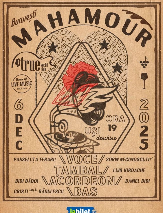 Pe 6 Decembrie, ora 19:00, pe scena True Club vom mai petrece o seară MAHAMOUR – o seară unde ne vom îmbăta muzical sufletul alături de artiști virtuoși și prieteni.