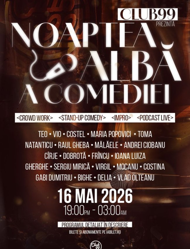 21:35 - 23:45 - Impro Show cu Teo, Costel, Emanuel Bighe, Delia, Natanticu & Marian + Stand Up Comedy cu Teo, Vio, Toma, Ioana Luiza, Tudor Costina & Vlad Olteanu
