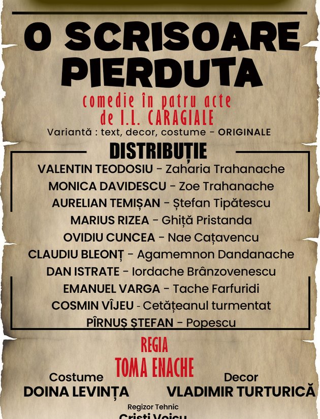 Pe scenă, publicul îi va regăsi pe Trahanache și Zoe, pe Tipătescu și Cațavencu, pe Farfuridi, Brânzovenescu și pe celebrul cetățean turmentat, în interpretări vibrante ce dau viață textului clasic.