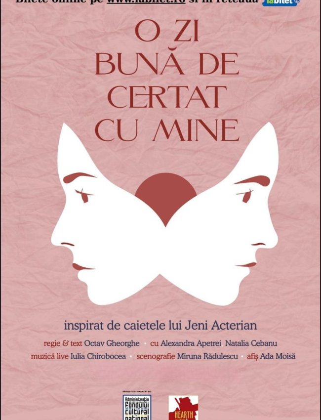 DISTRIBUȚIA: Text și regie: Octav Gheorghe Cu: Alexandra Apetrei, Natalia Cebanu Muzică live: Iulia Chirobocea Scenografie: Miruna Rădulescu Afiș: Ada Moisă Mai multe detalii pe www.asociatiahearth.ro 14+