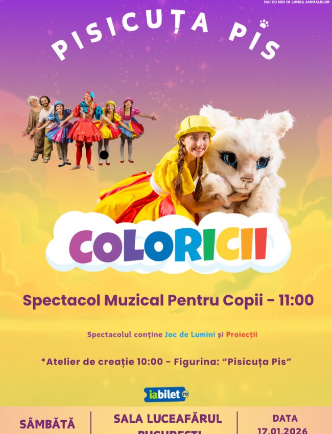 Înainte de spectacol, copiii își vor crea propria figurina Pis, pe care o vor lua cu ei în aventură. Pe scenă, Coloricii le vor arăta cum să aibă grijă de micuța lor Pis, transformând experiența într-un joc real de responsabilitate și bucurie.
