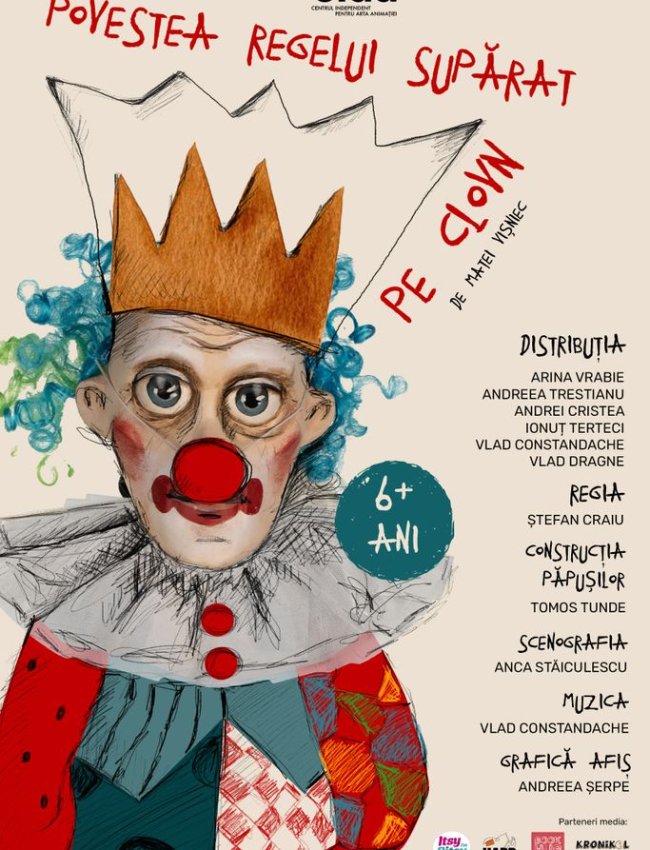 În universul comico-absurd al lui Matei Vișniec, păpușile se joacă de-a puterea, fiecare avându-și locul bine stabilit în orânduiala regatului. „Povestea regelui supărat pe clovn” este o un spectacol amuzant și tandru despre cum un rege poate deveni ridicol, un clovn — înțelept, iar artistul — indispensabil chiar și atunci când puterea crede că nu mai are nevoie de el.