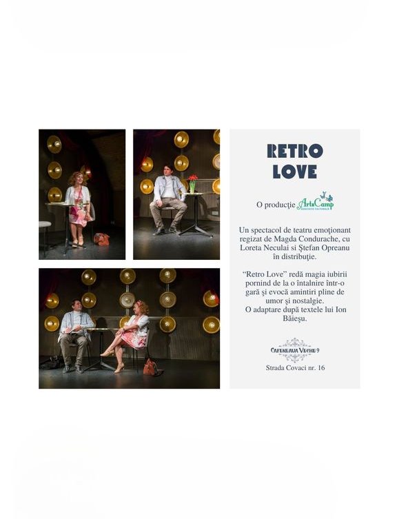 RETROLOVE adaptare după textele lui Ion Băieșu Regia: Magda Condurache Producție: Asociația Culturală Arts Camp O călătorie printre nuanțele vieții. Comicul de situație și de limbaj ne vorbește despre iubire și acceptarea în cuplu. Zâmbiți, vă rog!