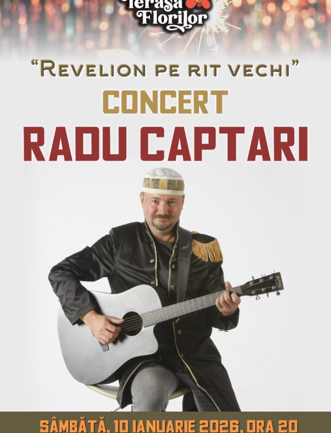 Pentru sârbi, ucraineni, ruşi şi lipoveni, Revelionul de rit vechi înseamnă mese îmbelșugate, muzică şi multă veselie. Așa că vă așteptam pe toți la Terasa Florilor, sâmbăta, 10 ianuarie, de la ora 20, să fiți parte a acestei petreceri, alături de Radu Captari, într-o seară magică cu muzică și bucurie, plină de cântece calde, atmosferă de sărbătoare și momente de neuitat!