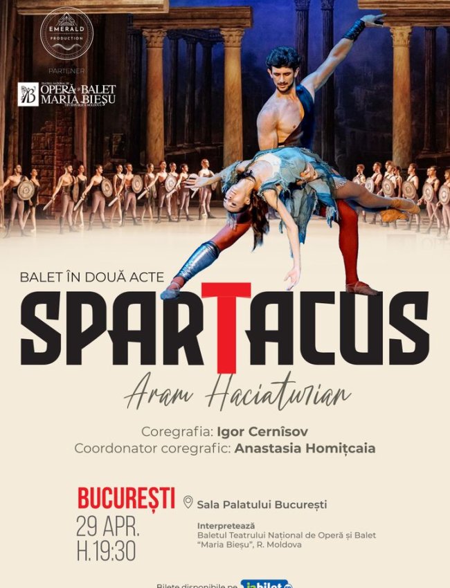 Inspirat din povestea legendarului gladiator trac, spectacolul impresionează prin forță dramatică, virtuozitate tehnică și o producție scenică amplă, aducând pe scenă balerini de top, decoruri spectaculoase și o energie artistică intensă.