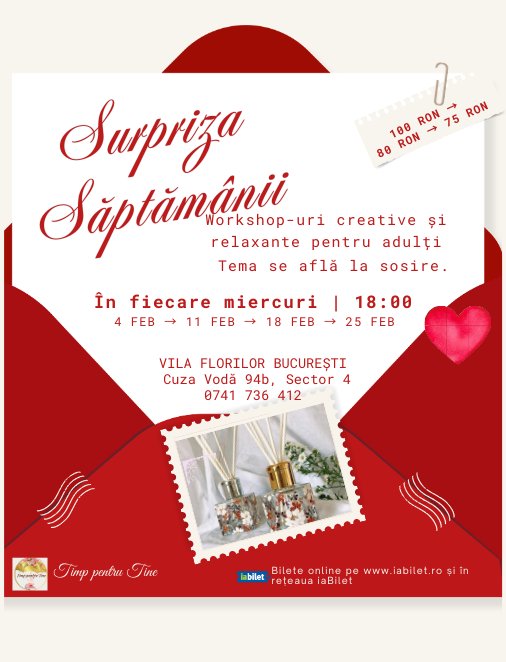 Reducere: 80 RON atelier persoană dacă participi la două ateliere într-o lună.