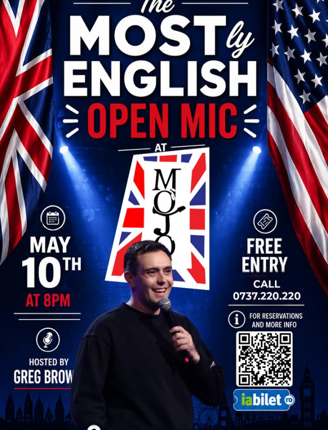 Entry is free. Book your spot : 0737.220.220 www.mojomusic.ro Come by with friends, grab a drink, and enjoy a night out in MOSTLYEnglish.If you’d like to perform email gregorybcomedy@gmail.com for a chance ata spot on the list!