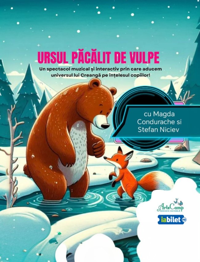 Muzical și interactiv, spectacolul "Ursul păcălit de vulpe" te invită în lumea lui Creangă, plină de umor și aventură, timp de 45 min.