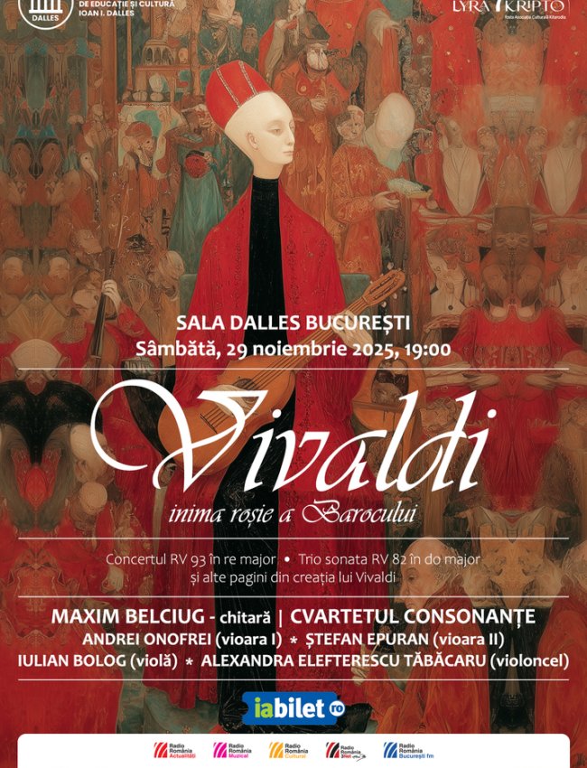 La această provocare și-au propus să răspundă chitaristul Maxim Belciug și cei patru minunați instrumentiști care alcătuiesc cvartetul Consonanțe al Filarmonicii Mihail Jora din Bacău: Andrei Onofrei (vioara I), Ștefan Epuran (vioara II), Iulian Bolog (violă) și Alexandra Elefterescu Tăbăcaru (violoncel). Alegând să ocolească cu bună știință emblematicele Anotimpuri, muzicienii au deschis vastul sipet de comori al preotului roșu și au întocmit un program ce are în centru Concertul RV 93 în re major, în aranjament pentru chitară și cvartet de coarde, și Trio sonata RV 82 în do major, la care se adaugă alte pagini din creația lui Vivaldi, de la lucrări exuberante, până la compoziții profund lirice, tulburătoare. Un program în care chitara, cu sunetul său solar și impunător prin bogăția de nuanțe, pulsează, când dramatic, când melancolic, când dansant, în peisajul plin de viață desenat de instrumentele cu coarde, cu ritmurile și armoniile lor mișcătoare.