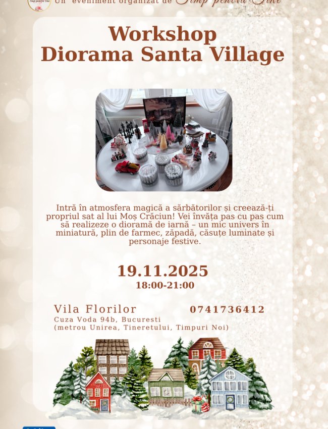 Participanții vor învăța pas cu pas cum să realizeze o dioramă de iarnă – un mic univers în miniatură, cu zăpadă, căsuțe luminate, brazi împodobiți și personaje vesele. Fiecare detaliu se va construi manual, din materiale sigure și ușor de folosit, dezvoltând creativitatea, îndemânarea și imaginația.