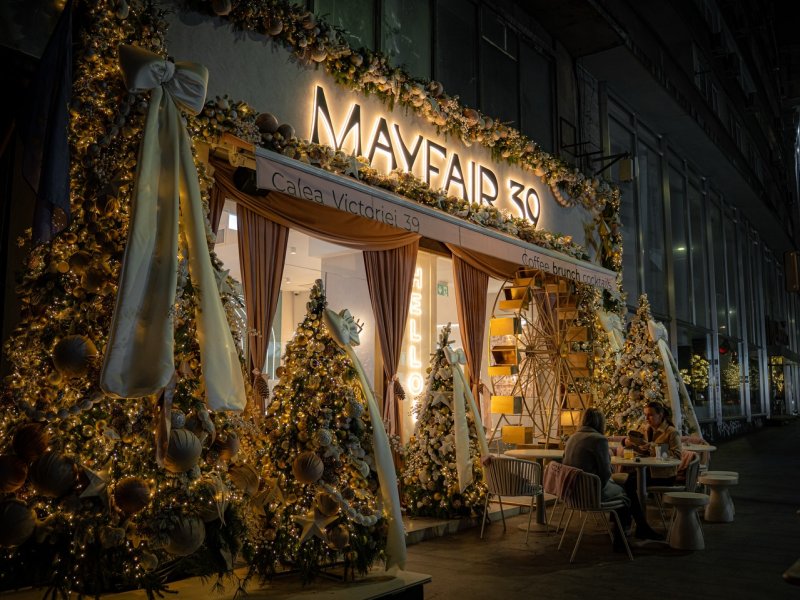 Mayfair 39 este genul de local care nu se joacă atunci când vine vorba de decorul de iarnă. Fațada devine, în decembrie, un punct de oprire pentru oricine trece pe Victoriei: brazi bine aleși, nuanțe calde, o lumină care îți dă impresia că intri într-un hol de hotel dintr-un oraș nordic. În interior, decorul nu e ostentativ, ci rafinat: verde închis, auriu, lumini discrete, detalii care transformă orice cafea într-o mică scenă de sezon