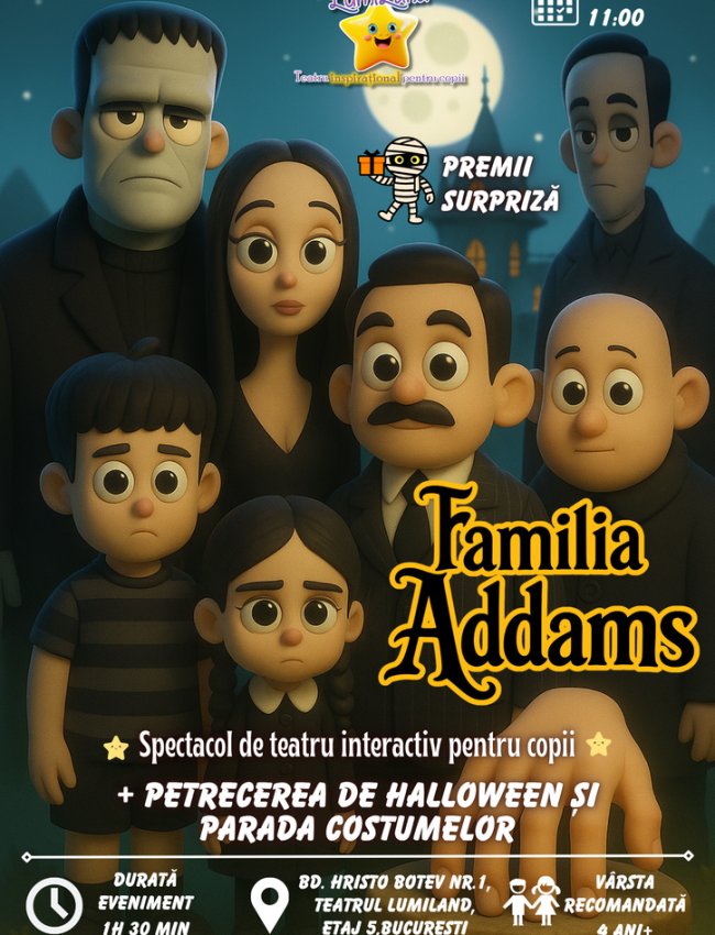 Pe 1 noiembrie, de la ora 11:00, te așteptăm la Teatrul LumiLand (Bd. Hristo Botev nr. 1, etaj 5, București) la un spectacol de teatru interactiv inspirat de celebra familie Addams — o experiență haioasă, plină de surprize și participare activă a copiilor!
